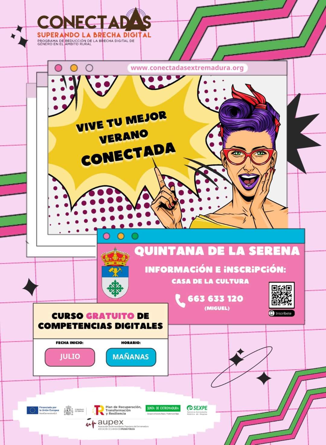 Con el eslogan 'Vive tu mejor verano Conectada', el programa está dirigido a mujeres en edad laboral, ya sean empleadas o desempleadas. Al completar el curso se obtendrá un título certificado por el SEXPE. Las usuarias aprenderán a manejarse con aspectos del día a día: navegar de forma segura por Internet, solicitar citas, renovar demanda, uso y privacidad de redes sociales, banca online, administración pública, programación, Inteligencia Artificial, entre otras cosas.