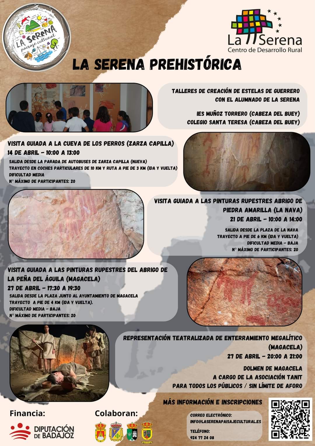 Estas actividades comprenden la realización de talleres de creación de estelas de guerrero en los centros educativos de la localidad de Cabeza del Buey, una serie de visitas a los abrigos de pinturas esquemáticas mejor conservados de La Serena y una representación teatralizada de un enterramiento megalítico, que tendrá lugar en el dolmen de Magacela.