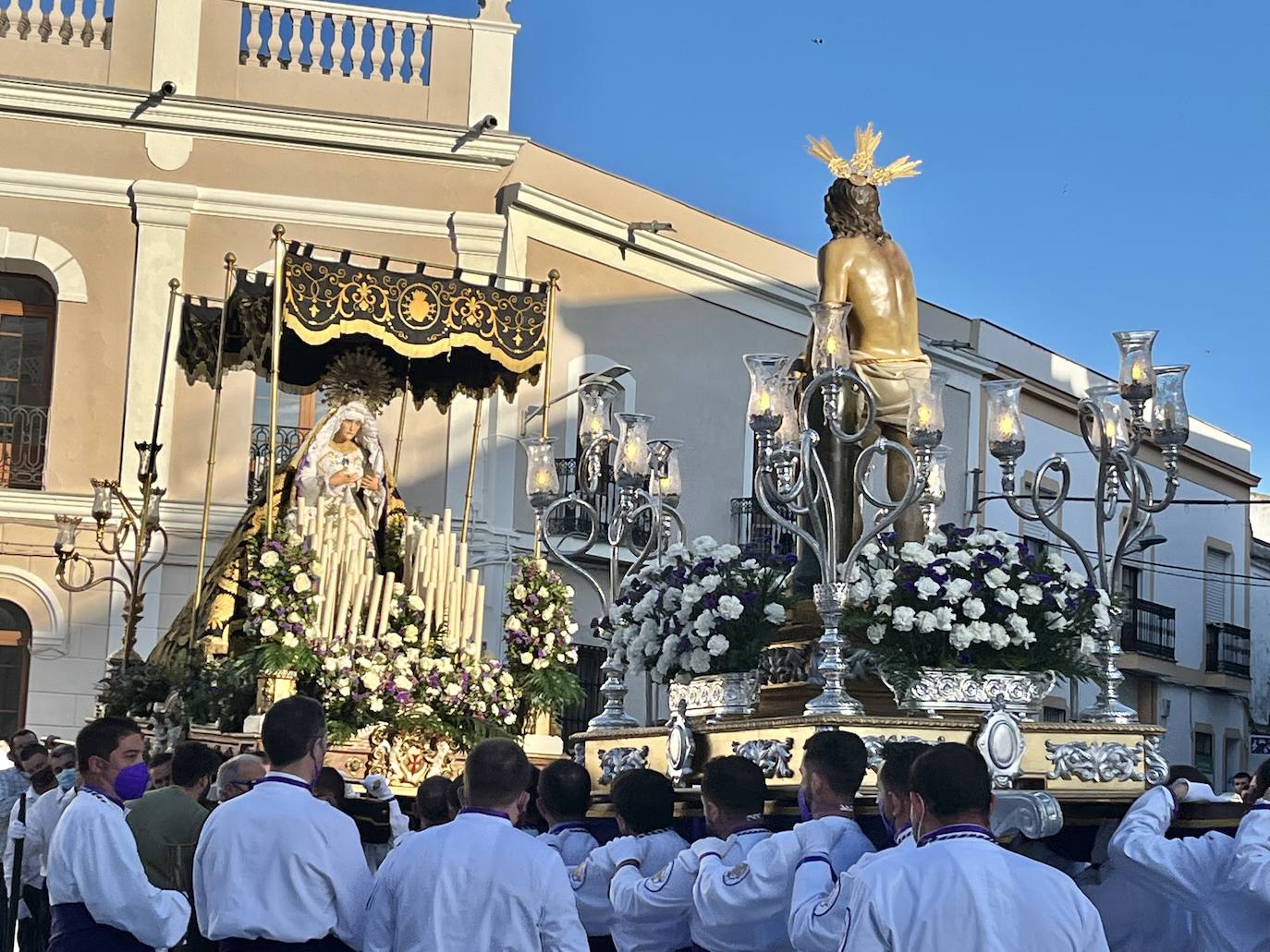 La salida de Jesús, portado por sus costaleros y la llegada de la Virgen, que acude a su encuentro, emocionaron a los vecinos que añoraban esta estampa a la caída del sol el Jueves Santo. Las trompetas, cornetas y tambores de la banda de la cofradía pusieron la nota musical haciendo aún más emotivo el esperado encuentro.