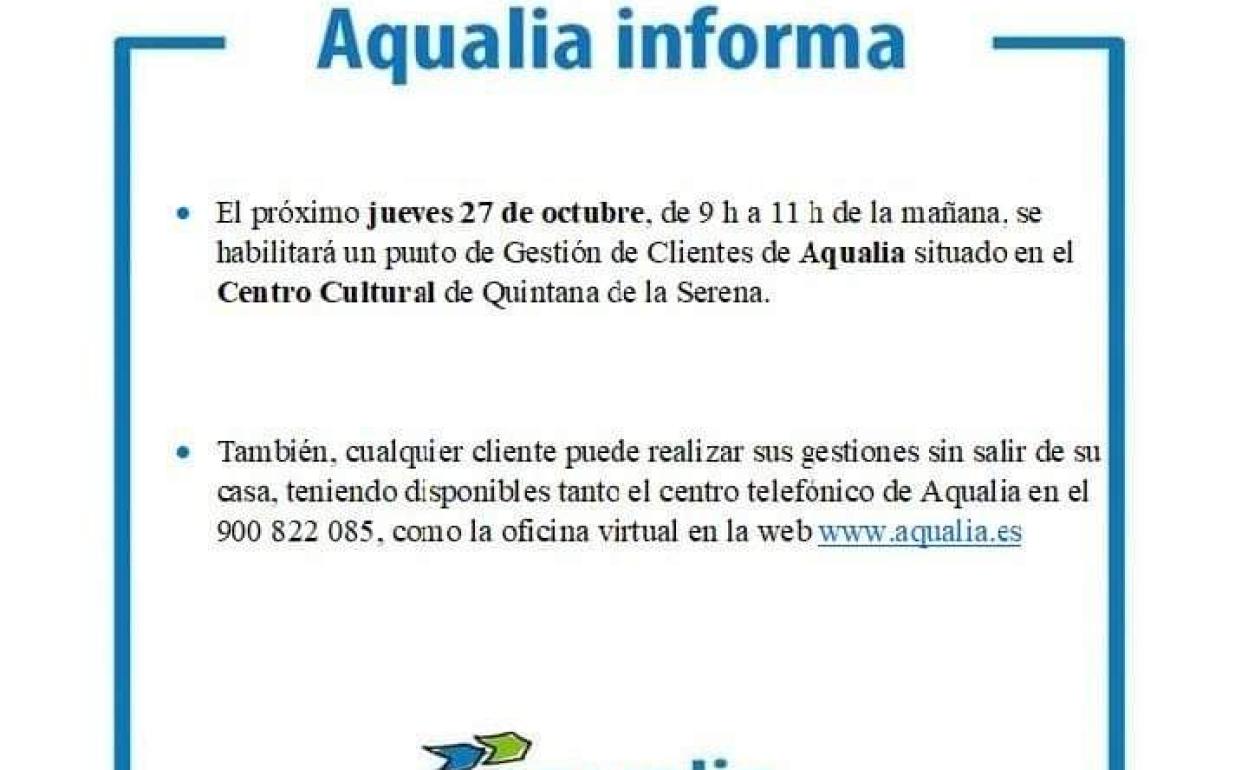 El Ayuntamiento de Quintana de la Serena informa, que mañana jueves 27 de octubre, de 9 a 11 horas de la mañana, habrá un punto de gestión de clientes por parte de Aqualia en el centro cultural de la localidad para todo vecino que necesite información.