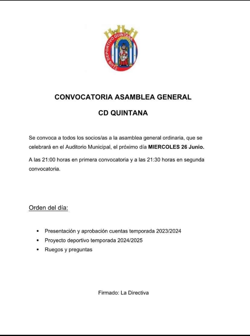 El CD Quintana convoca a todos los socios y socias para una Asamblea General para el próximo miércoles 24 de junio, a partir de las ... 21.00 horas.