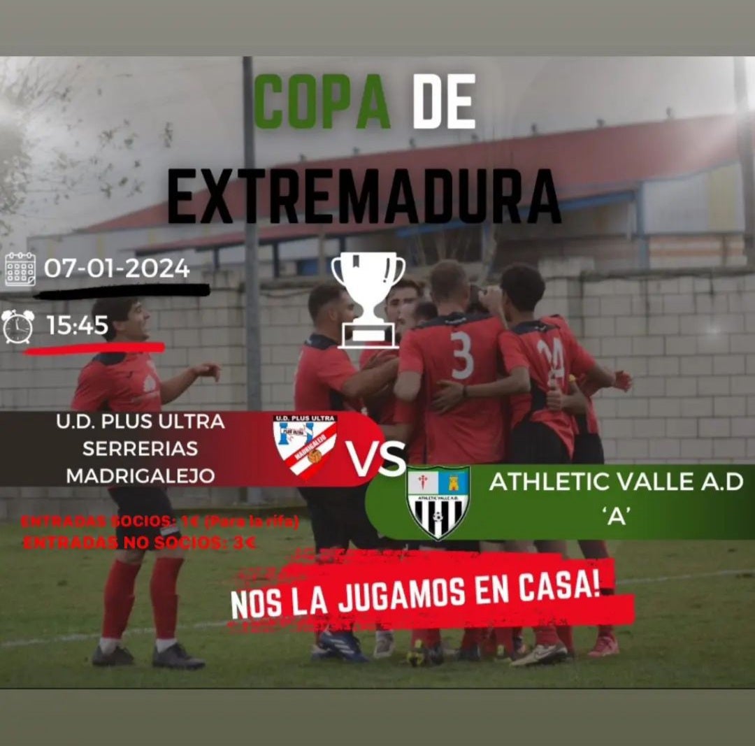 En este caso, los vallejos visitan al Plus Ultra Madrigalejo, equipo de Segunda División Extremeña, pero de diferente grupo que el Athletic Valle, el domingo 7 de enero a las 15:45 horas de la tarde.