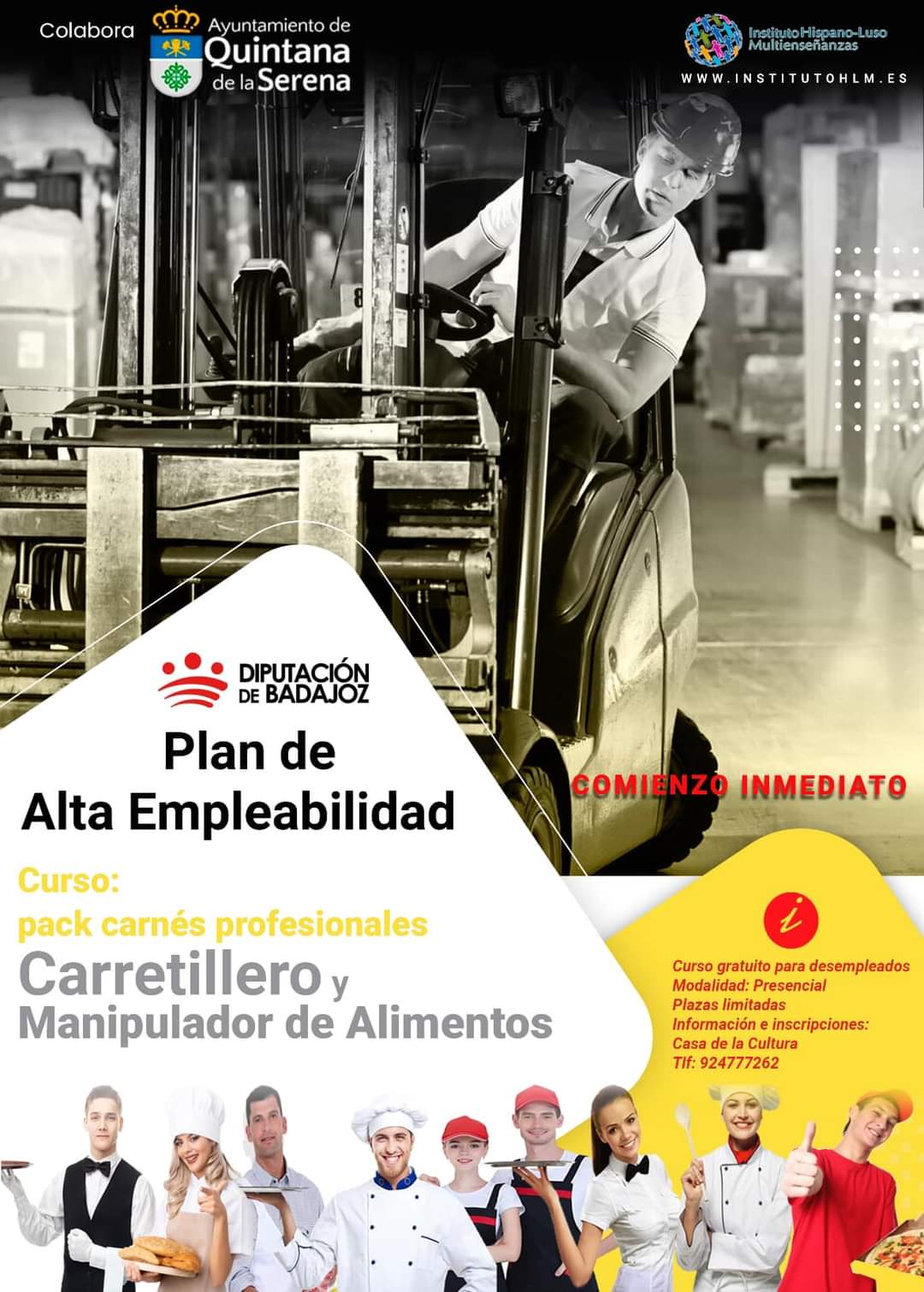 El Ayuntamiento de Quintana de la Serena, ha anunciado a través de RRSS la oferta de un curso de formación, en este caso presenta el de Carretillero y manipulador de alimentos.