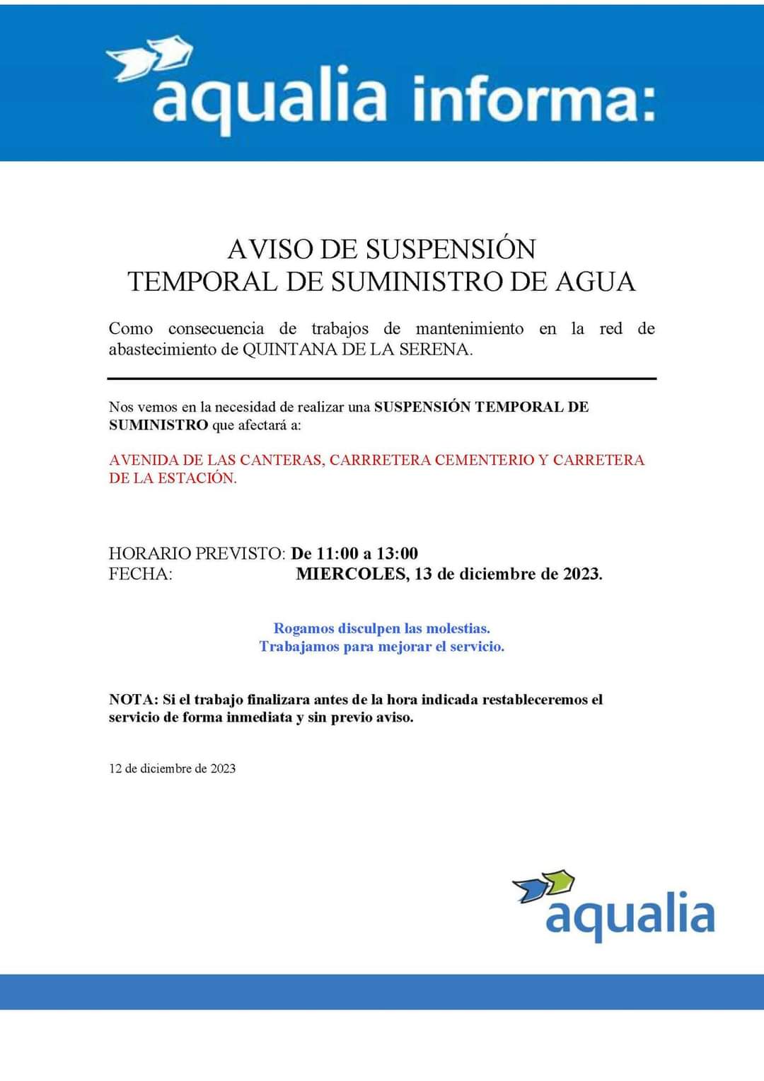 El Ayuntamiento de Quintana ha informado de un corte el día miércoles 13 de diciembre, que le han comunicado la empresa de suministro de agua, ... como consecuencia de la mejora del abastecimiento de agua.