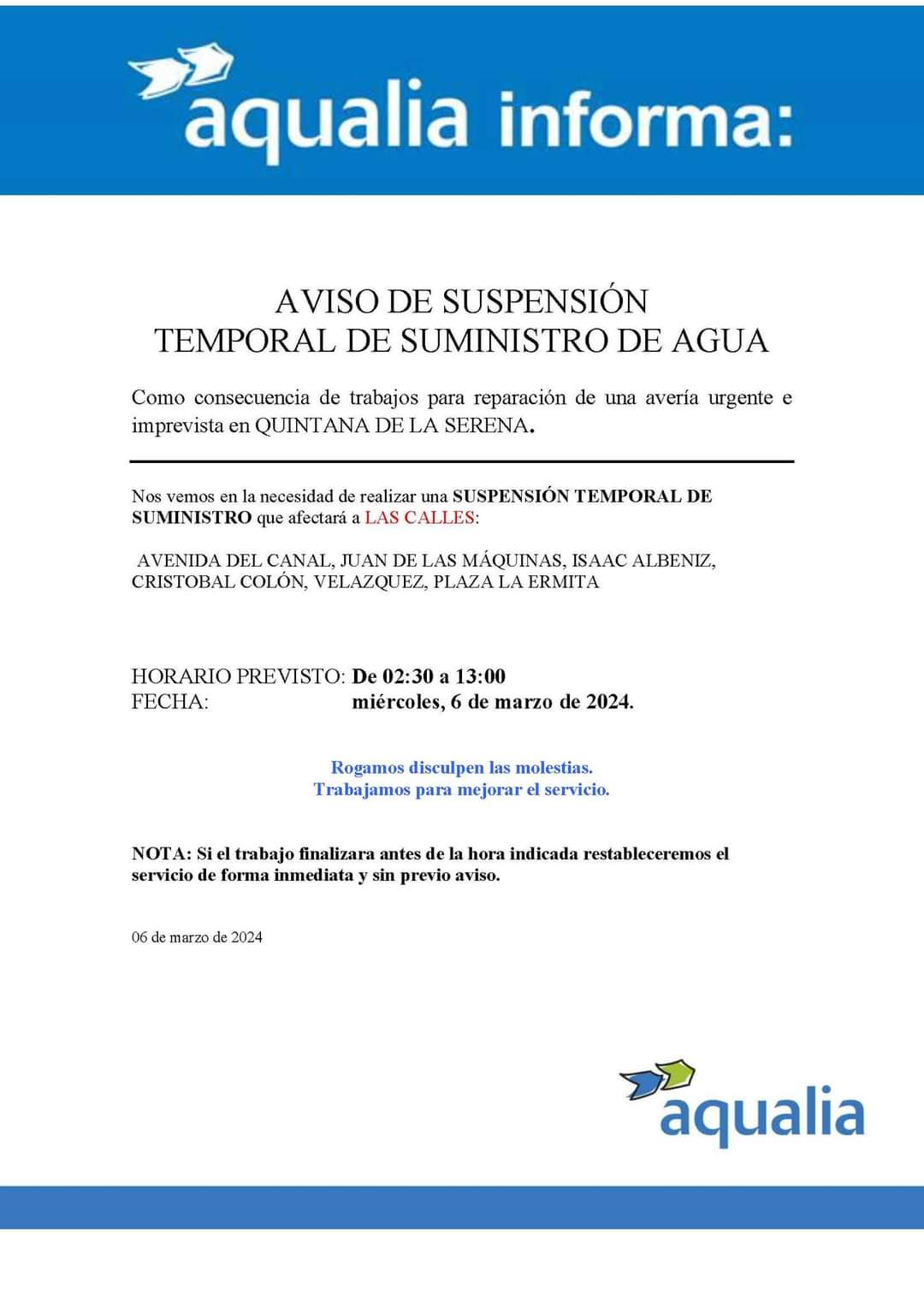 El Ayuntamiento de Quintana ha informado de un corte el día miércoles 6 de marzo, que le han comunicado la empresa de suministro de agua, ... como consecuencia de la mejora del abastecimiento de agua.