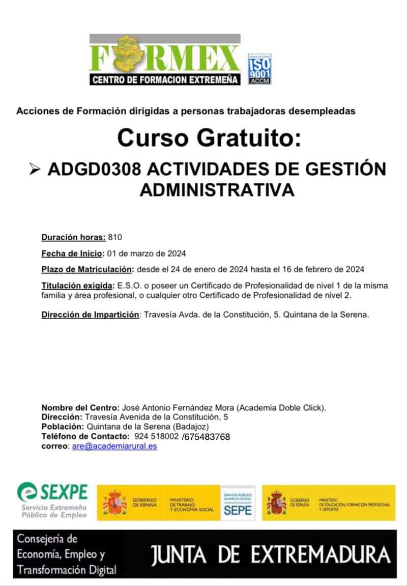A través del Centro de Formación extremeña, se ha anunciado la oferta de un nuevo curso de formación, en este caso presenta el de Actividades ... de gestión administrativa, con una duración de 810 horas.
