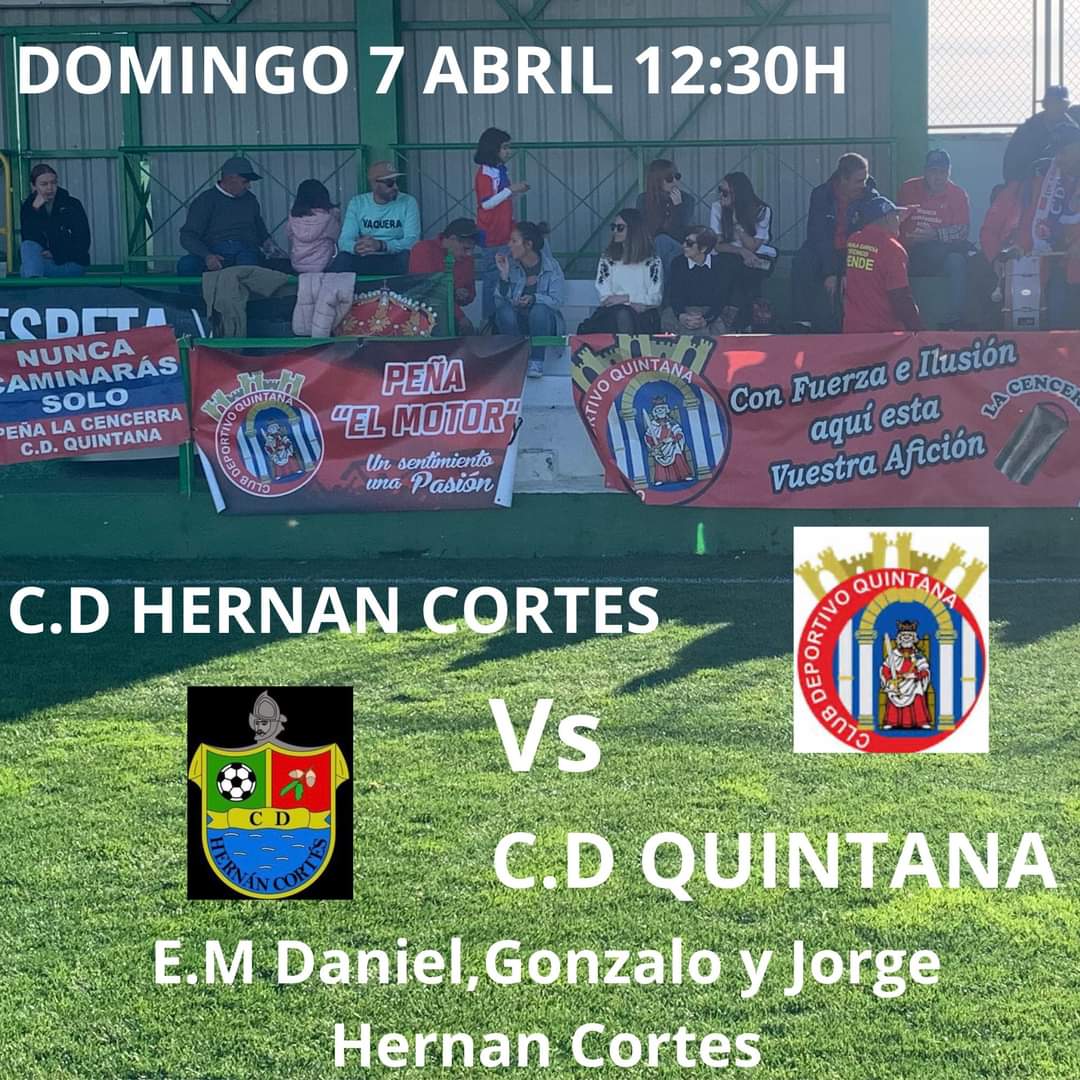 El CD Quintana afronta el próximo domingo 7 de abril, a las 12:30 horas de la mañana, una de las salidas más difíciles de lo que queda de temporada. Los quintanenses se desplazan a Hernán Cortés para enfrentarse al CD Hernán Cortés, quinto clasificado actualmente de la clasificación, y rival directo de los rojillos para conseguir un puesto de promoción de ascenso a Tercera Rfef.