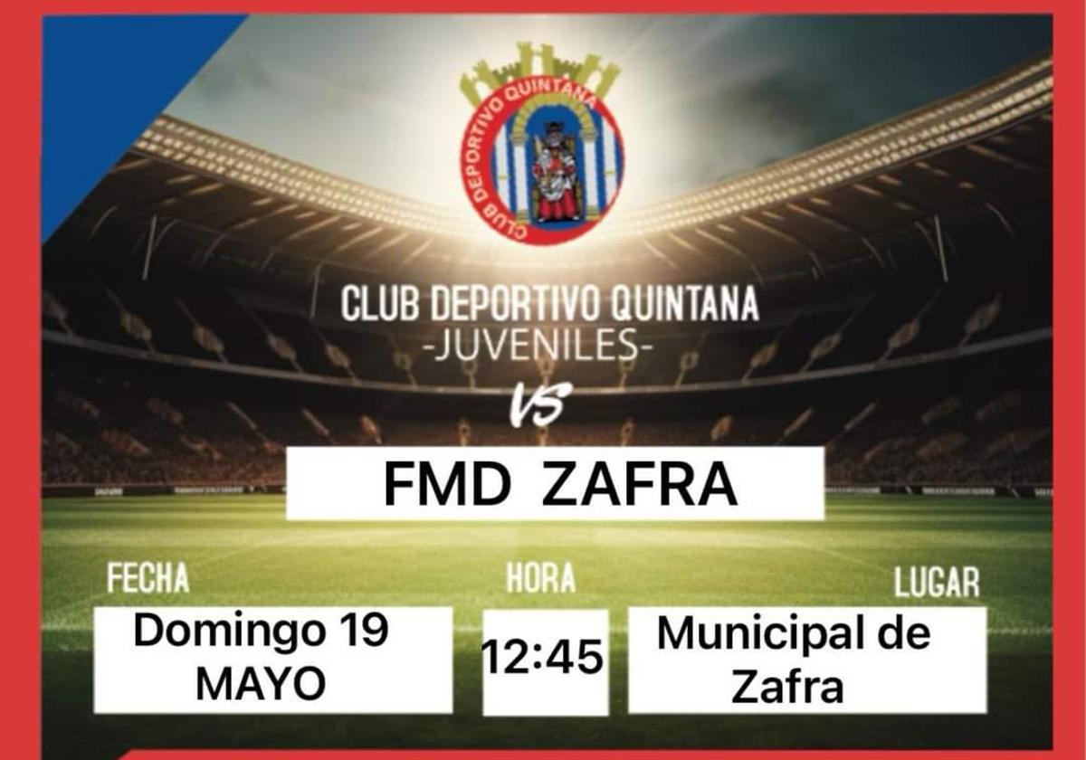 El CD Quintana Juvenil busca seguir con su histórica temporada y el siguiente paso el próximo domingo 19 de mayo en la localidad de Zafra, buscando pasar la primera ronda y seguir en la pelea deportiva de la promoción de ascenso a Liga Nacional Juvenil.