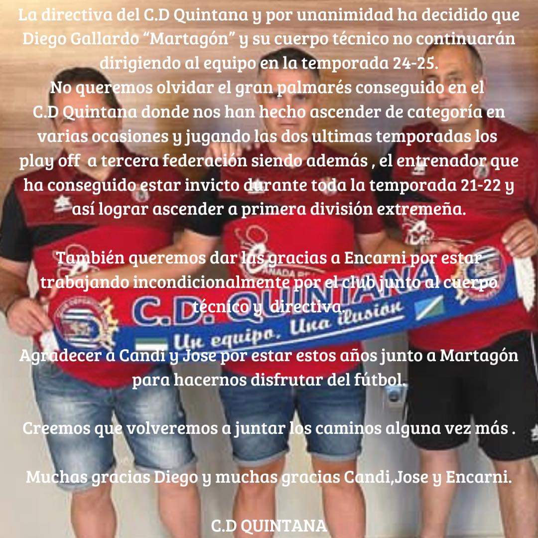 El CD Quintana anunció el pasado viernes 31 de mayo la salida del entrenador, Diego Gallardo, de cara a la temporada 2024/2025.