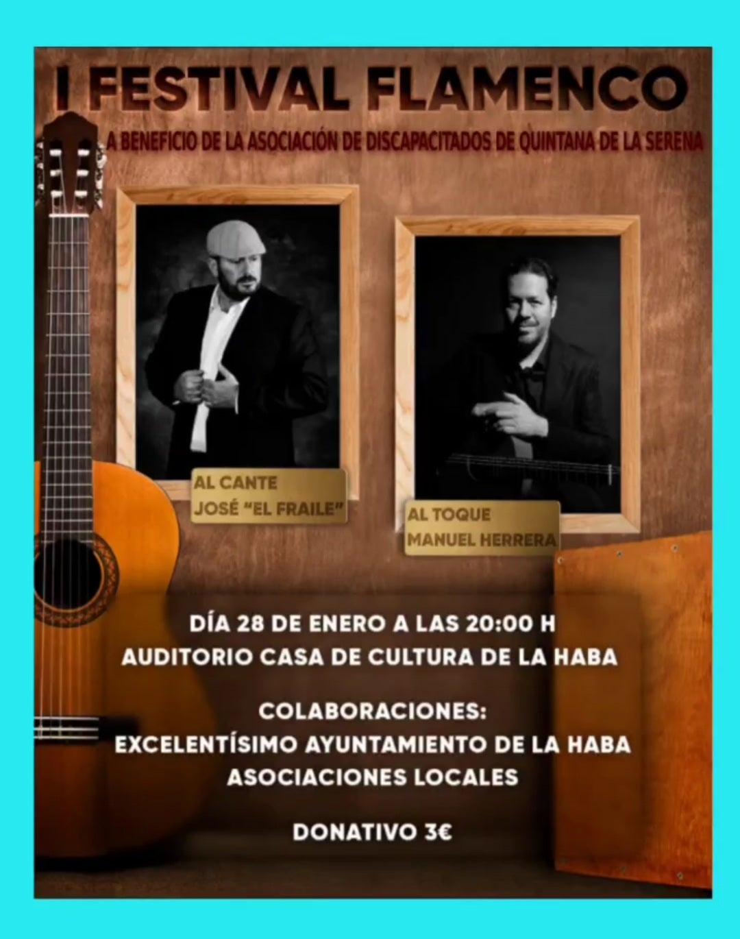 El Ayuntamiento de La Haba anunció el I Festival Flamenco que se celebrará en Auditorio Casa de la cultura de La Haba el próximo 28 de Enero a las 20:00 horas. El festival, va a contar con José «El Fraile» al cante y con Manuel Herrera al toque.