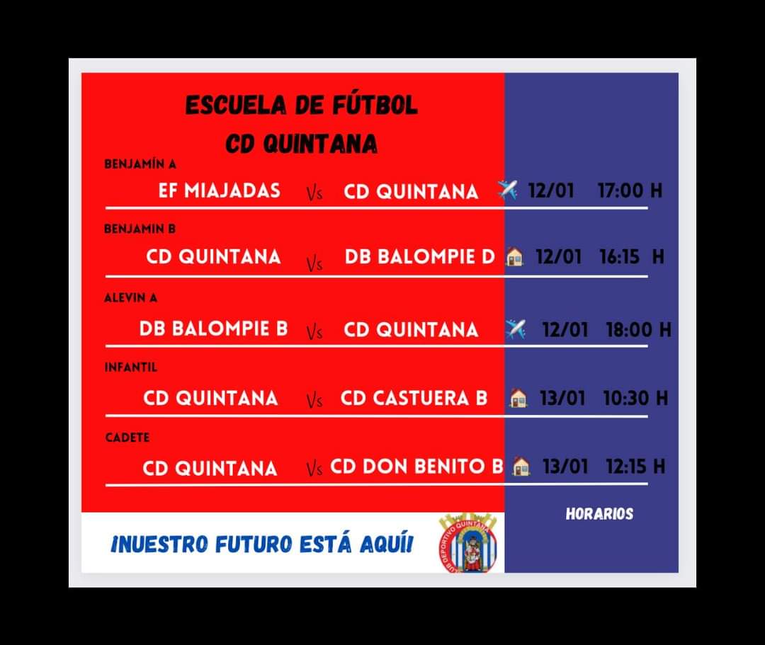 Nueva jornada de partidos durante el fin de semana para los equipos de la cantera del CD Quintana, con cinco partidos, tres de ellos en el Municipal de Quintana y dos fuera de casa.