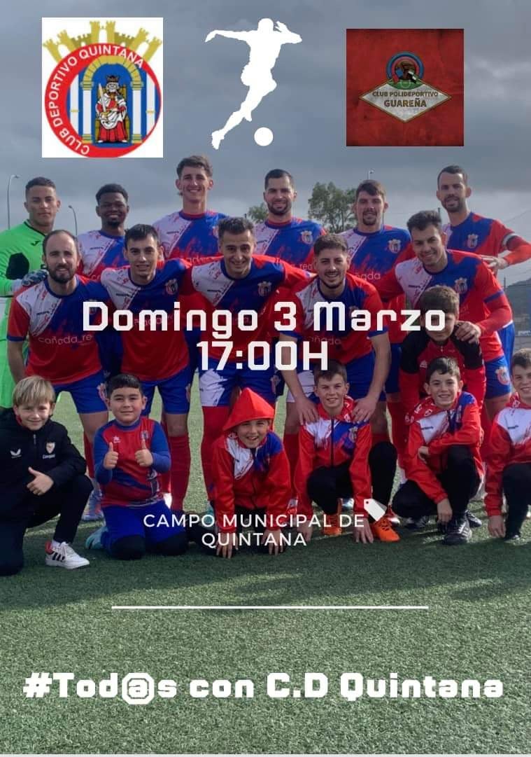 El CD Quintana afronta un decisivo encuentro con el objetivo de sumar los tres puntos en el Municipal de Quintana. Tras obtener una importante victoria frente al Racing Mérida por 0-4, los rojillos pelean por conseguir el objetivo de mantener el tercer puesto clasificatorio frente al CD Racing Mérida y el CD Hernán Cortés, sus inmediatos perseguidores, así como recortar puntos al segundo clasificado, el CF Campanario.