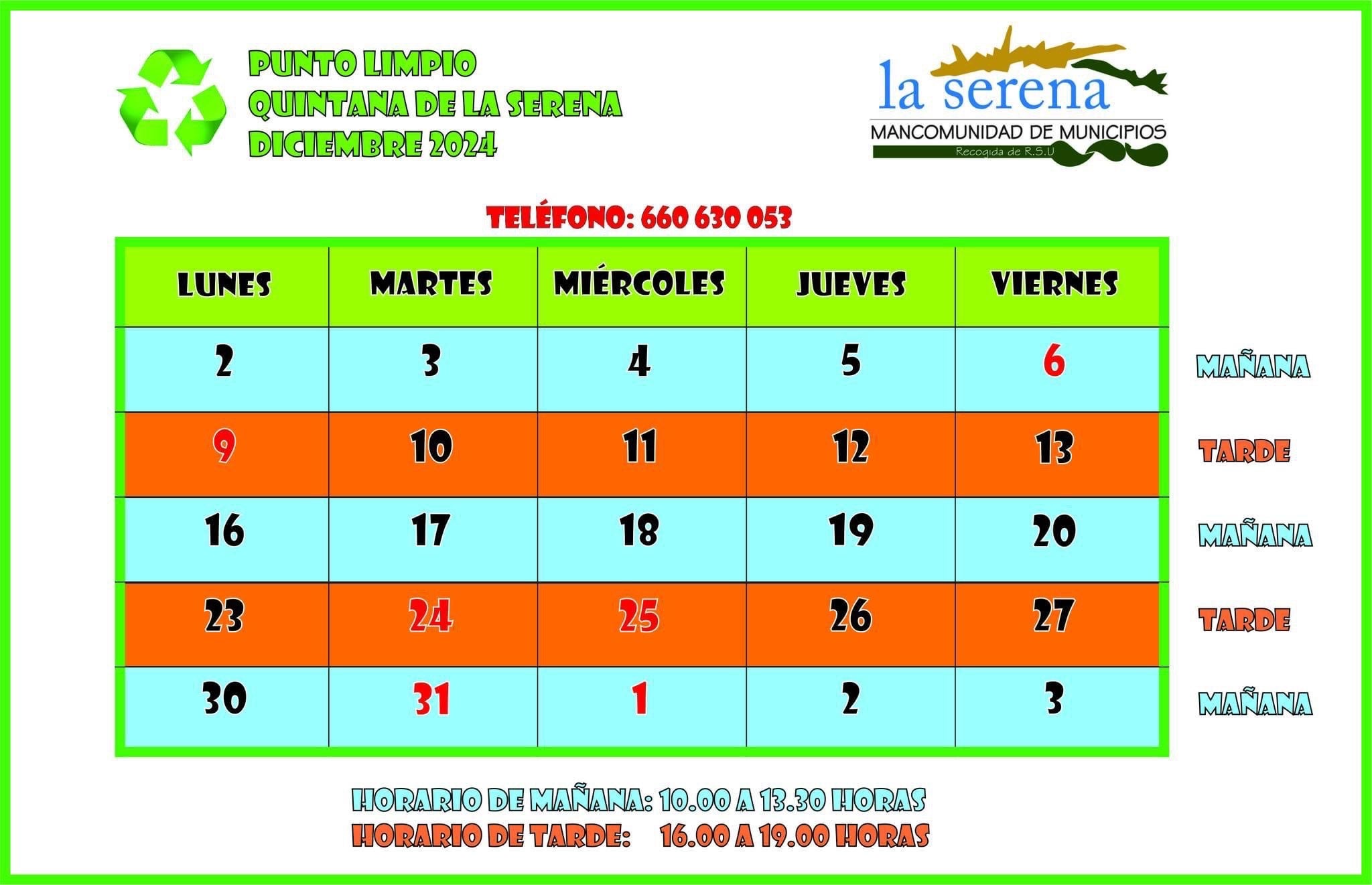 Horario del punto limpio para el mes de diciembre