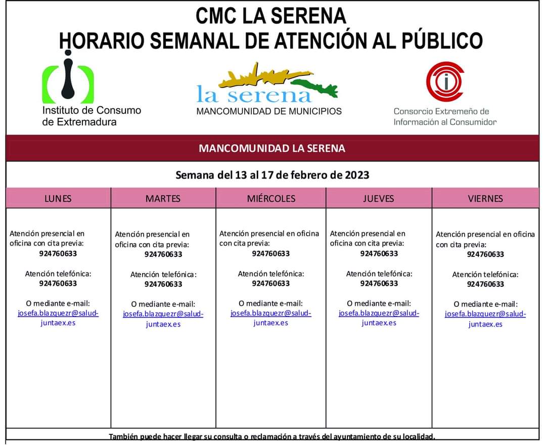 La Mancomunidad de Municipios de La Serena ha anunciado el horario de Atención al público del CMC La Serena para la semana del 13 al ... 17 de febrero, con la ruta que se hará por todos los municipios que la conforman.