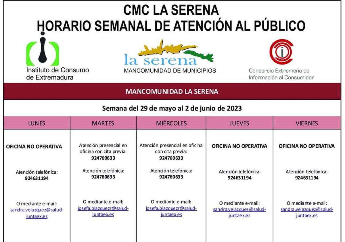 La Mancomunidad de Municipios de La Serena ha anunciado el horario de Atención al público del CMC La Serena para la semana del 29 de mayo al 2 de junio, con la ruta que se hará por todos los municipios que la conforman.