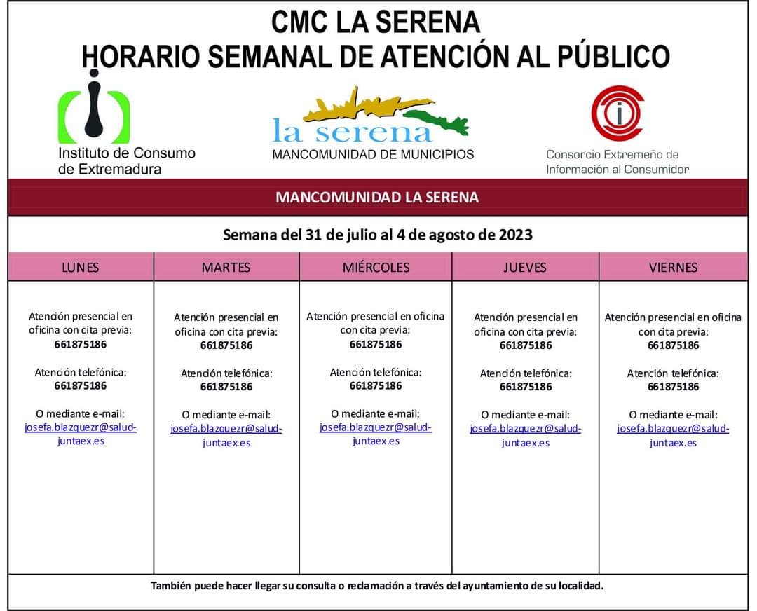 La Mancomunidad de Municipios de La Serena ha anunciado el horario de Atención al público del CMC La Serena para la semana del 31 de julio al 4 de agosto.