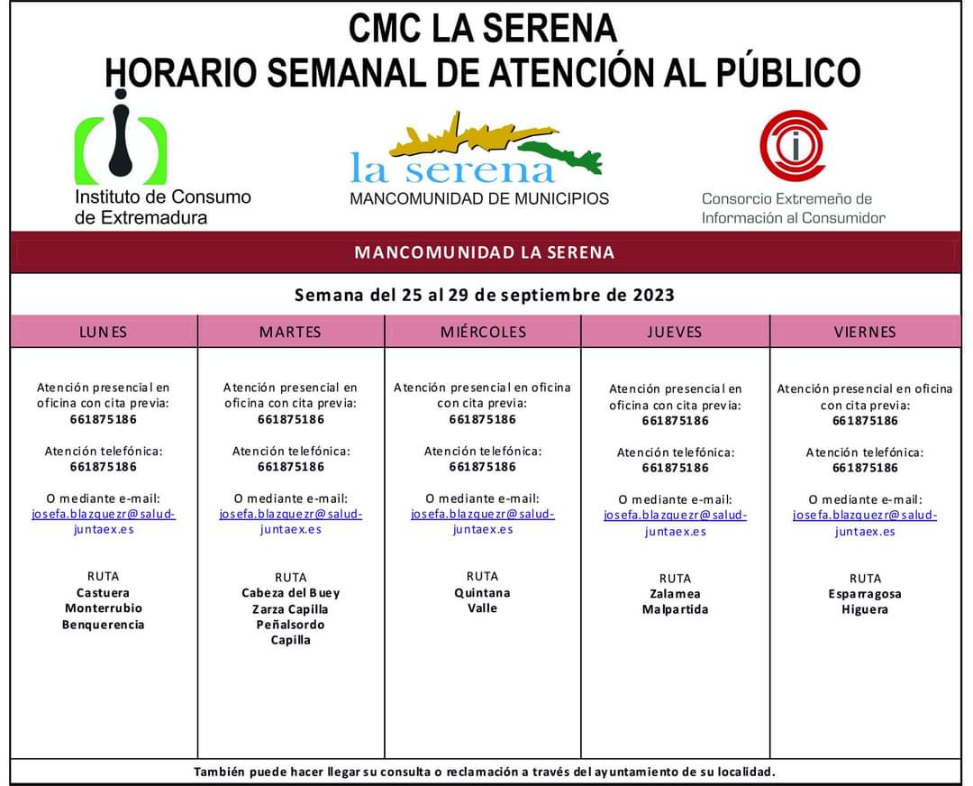 La Mancomunidad de Municipios de La Serena ha anunciado el horario de Atención al público del CMC La Serena para la semana del 25 al 29 de septiembre, con la ruta que se hará por todos los municipios que la conforman.