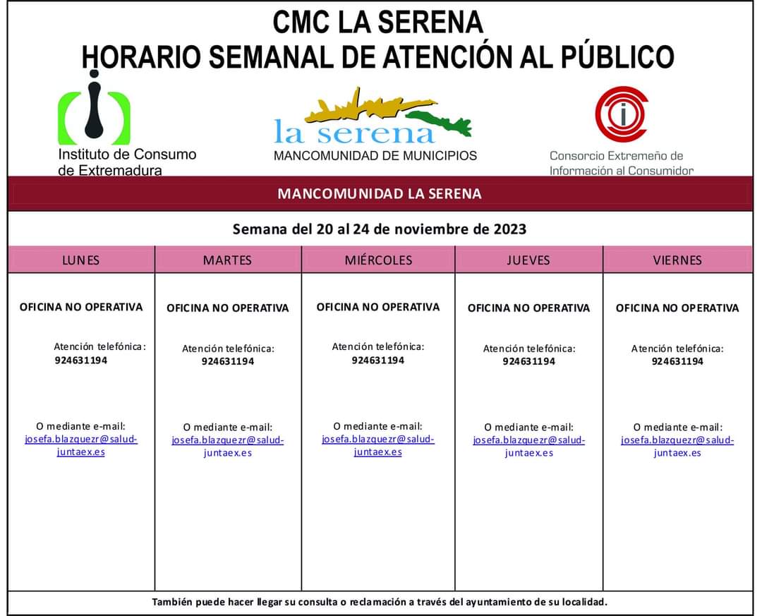 La Mancomunidad de Municipios de La Serena ha anunciado el horario de Atención al público del CMC La Serena para la semana del 20 al ... 24 de noviembre.