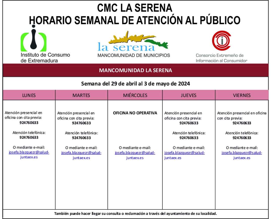 La Mancomunidad de Municipios de La Serena ha anunciado el horario de Atención al público del CMC La Serena para la semana del 29 de abril al 3 de mayo.