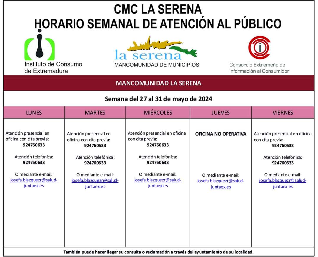 La Mancomunidad de Municipios de La Serena ha anunciado el horario de Atención al público del CMC La Serena para la semana del 27 al ... 31 de mayo.
