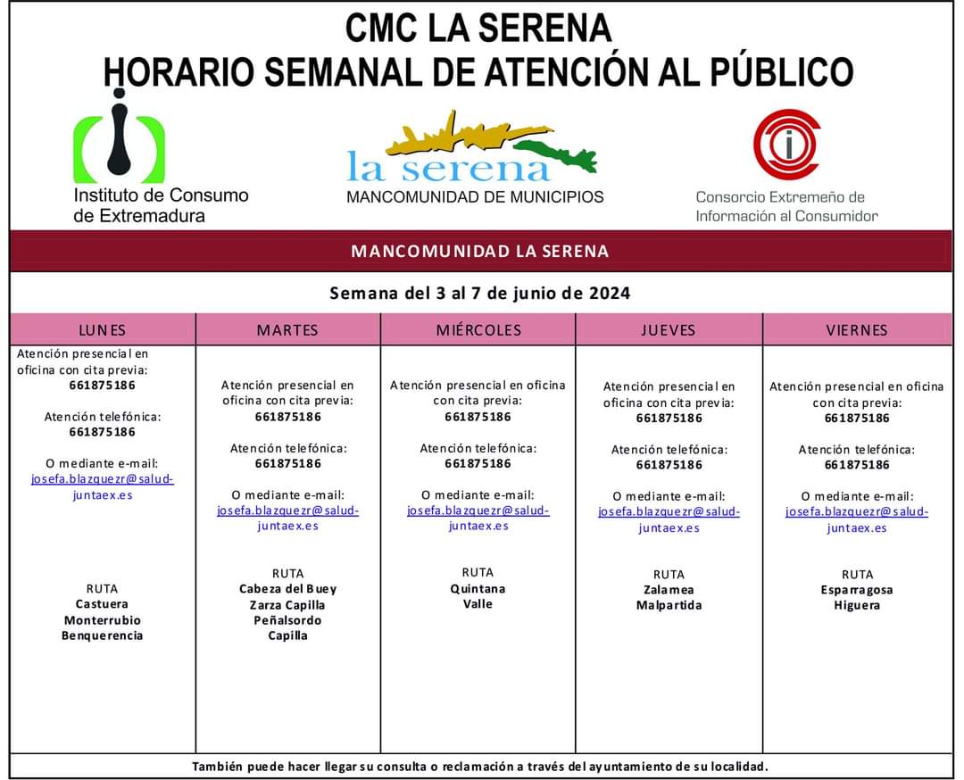 La Mancomunidad de Municipios de La Serena ha anunciado el horario de Atención al público del CMC La Serena para la semana del 3 al 7 de junio, con la ruta que se hará por todos los municipios que la conforman.