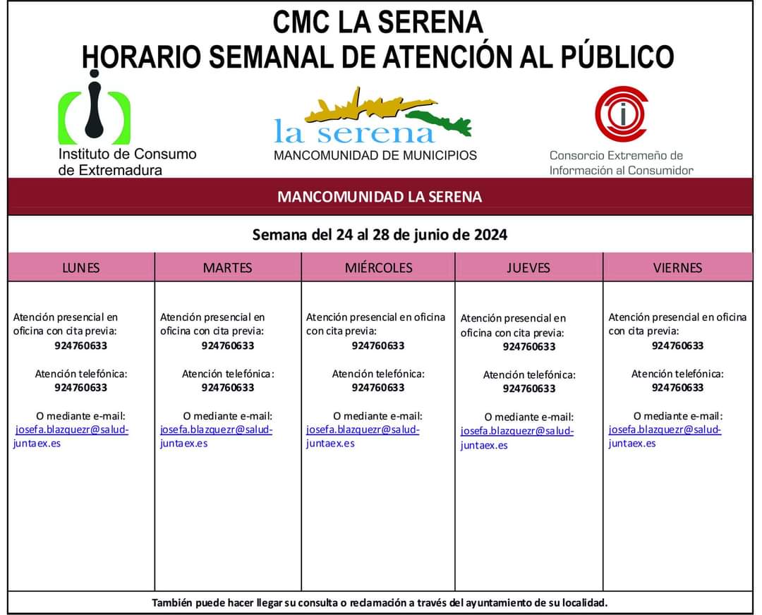 La Mancomunidad de Municipios de La Serena ha anunciado el horario de Atención al público del CMC La Serena para la semana del 24 al ... 28 de junio con la ruta que se hará por todos los municipios que la conforman.