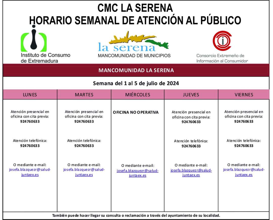 La Mancomunidad de Municipios de La Serena ha anunciado el horario de Atención al público del CMC La Serena para la semana del 1 al ... 5 de julio.