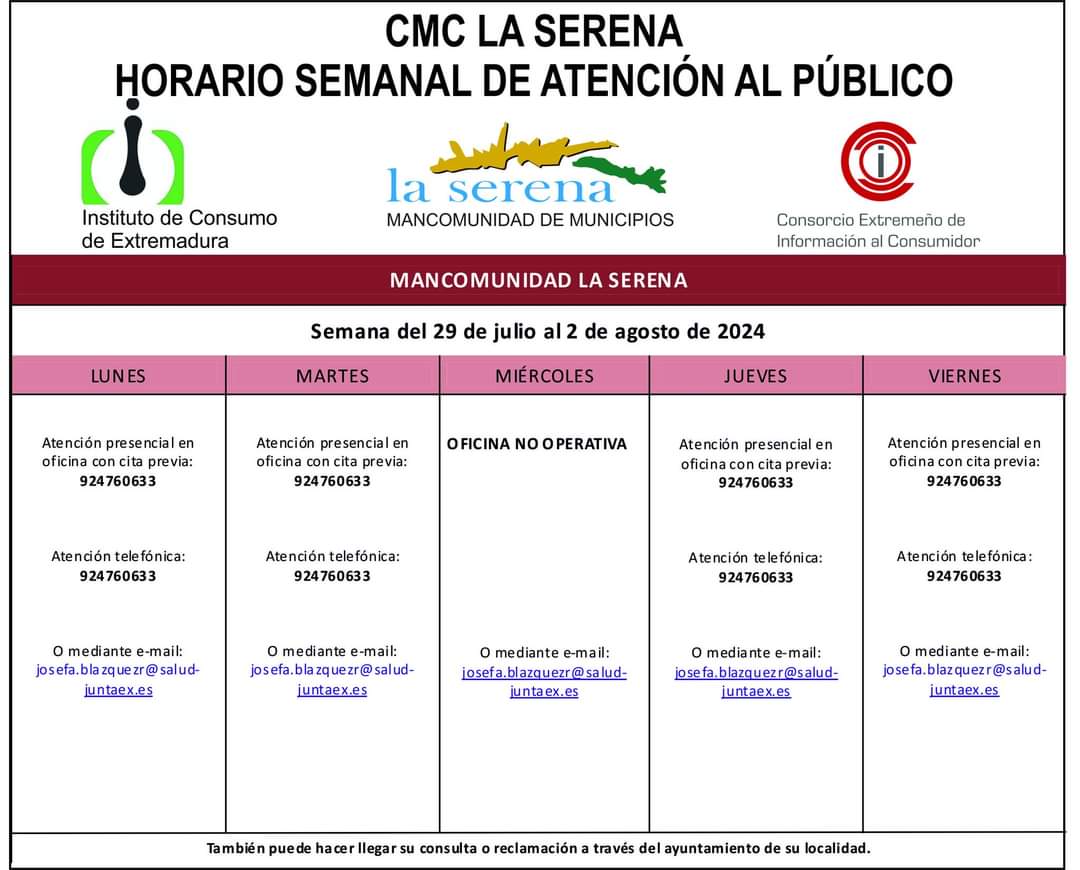 La Mancomunidad de Municipios de La Serena ha anunciado el horario de Atención al público del CMC La Serena para la semana del 29 de ... julio al 2 de agosto.