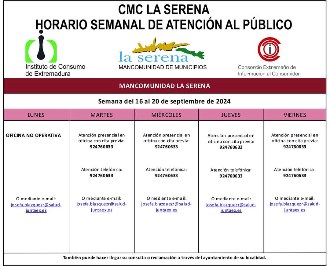 La Mancomunidad de Municipios de La Serena ha anunciado el horario de Atención telefónica del CMC La Serena para la semana del 16 al 20 de septiembre.