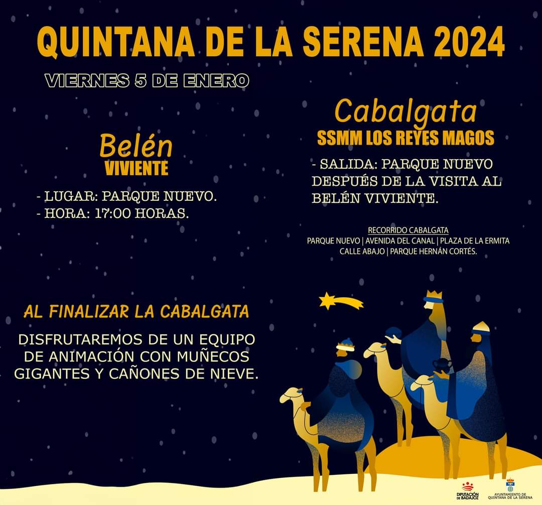 El Ayuntamiento de Quintana de la Serena ha anunciado, a través de RRSS, que el día 5 de enero, a partir de las 17:00 horas, en el Parque Nuevo se realizará la representación del tradicional Belén Viviente 2024.