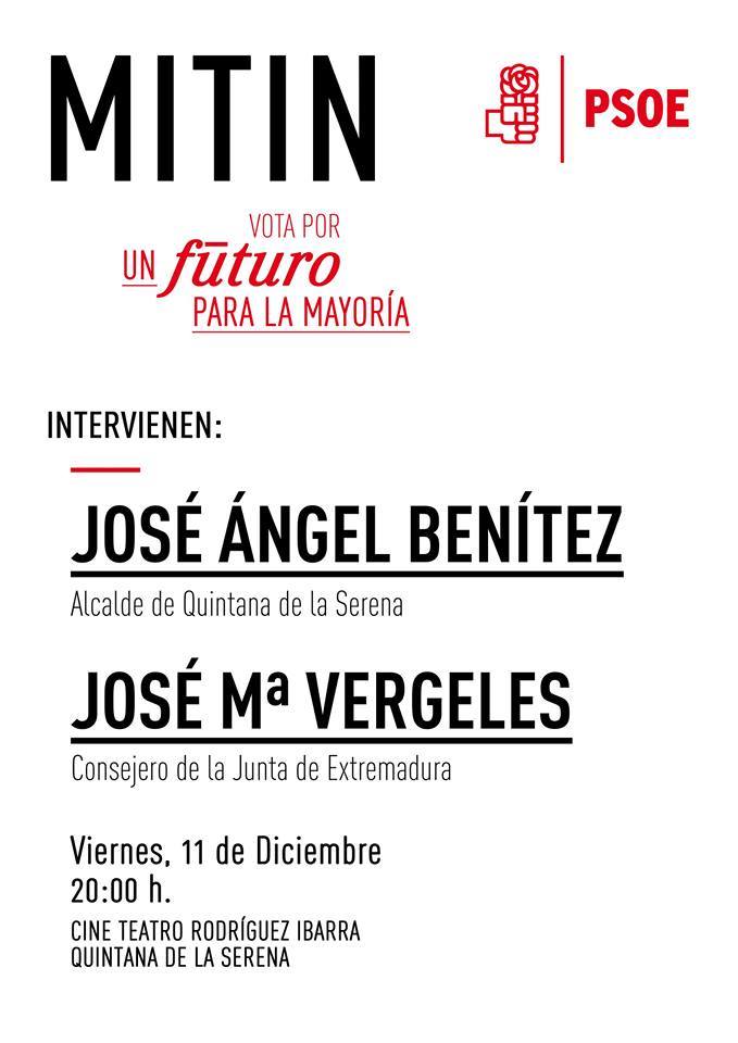 Bajo el lema Vota por un futuro para la mayoría intervendrán el alcalde, José Ángel Benítez y el consejero de Sanidad y Políticas Sociales de la Junta de Extremadura, José Mª Vergeles.