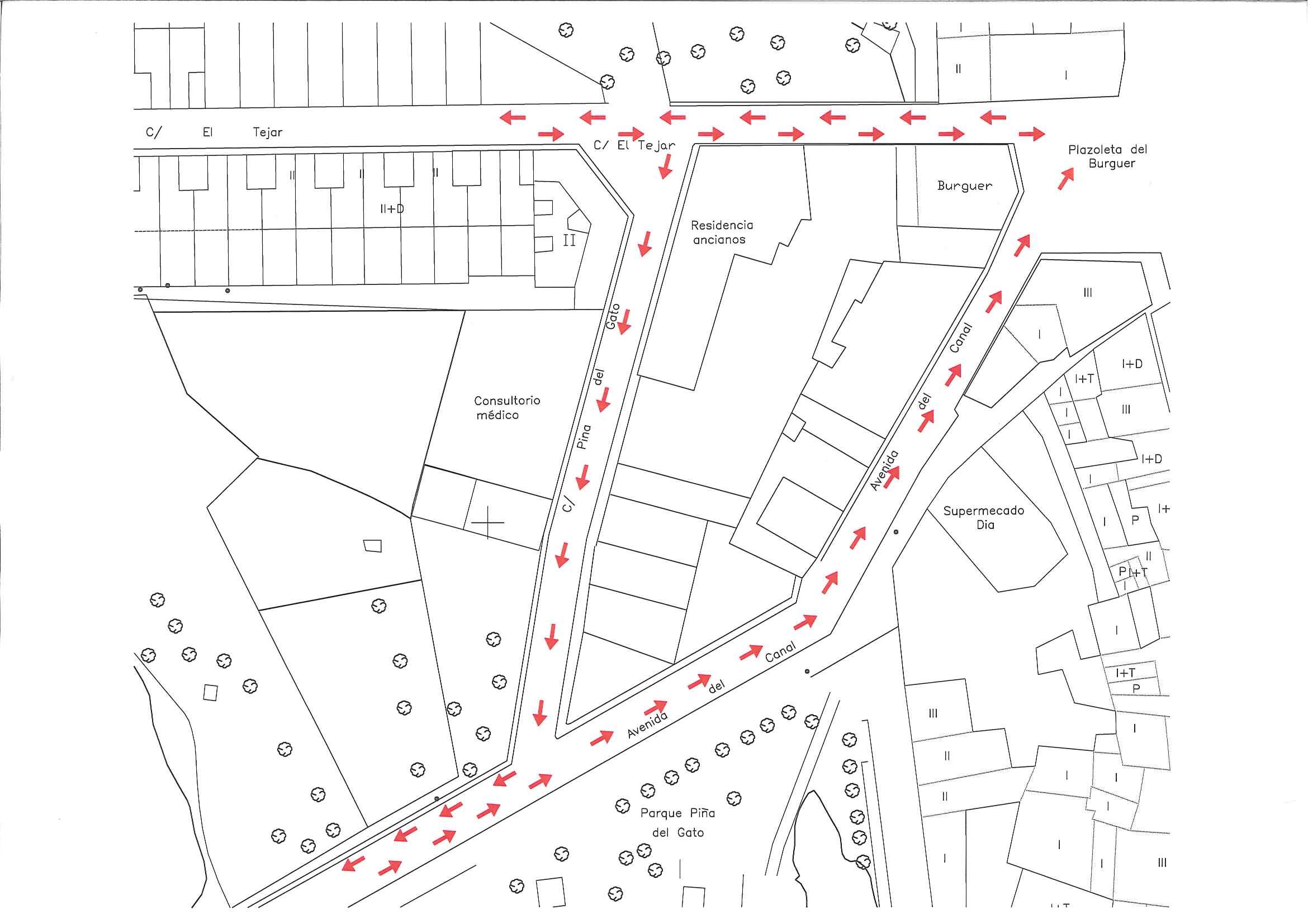 En concreto, a partir de hoy lunes 1 de febrero, se regulará el tráfico de la avenida del Canal que será de sentido único hasta la plaza del Burguer y la calle de Piña del Gato (consultorio). Tendrá sentido de circulación como una rotonda.