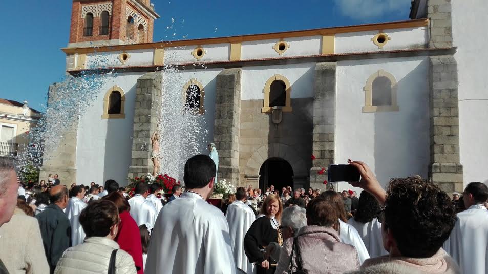 Pues en esta ocasión, un imprevisto impidió que la imagen de la Virgen saliera en procesión tras desprenderse una de sus andas durante el encuentro en que las dos imágenes se encontraban en una emocionante carrerilla al son de la música de la banda y los tiros de los escopeteros. Una vez juntas los dos pasos los más pequeños lanzaron claveles rojos y globos.