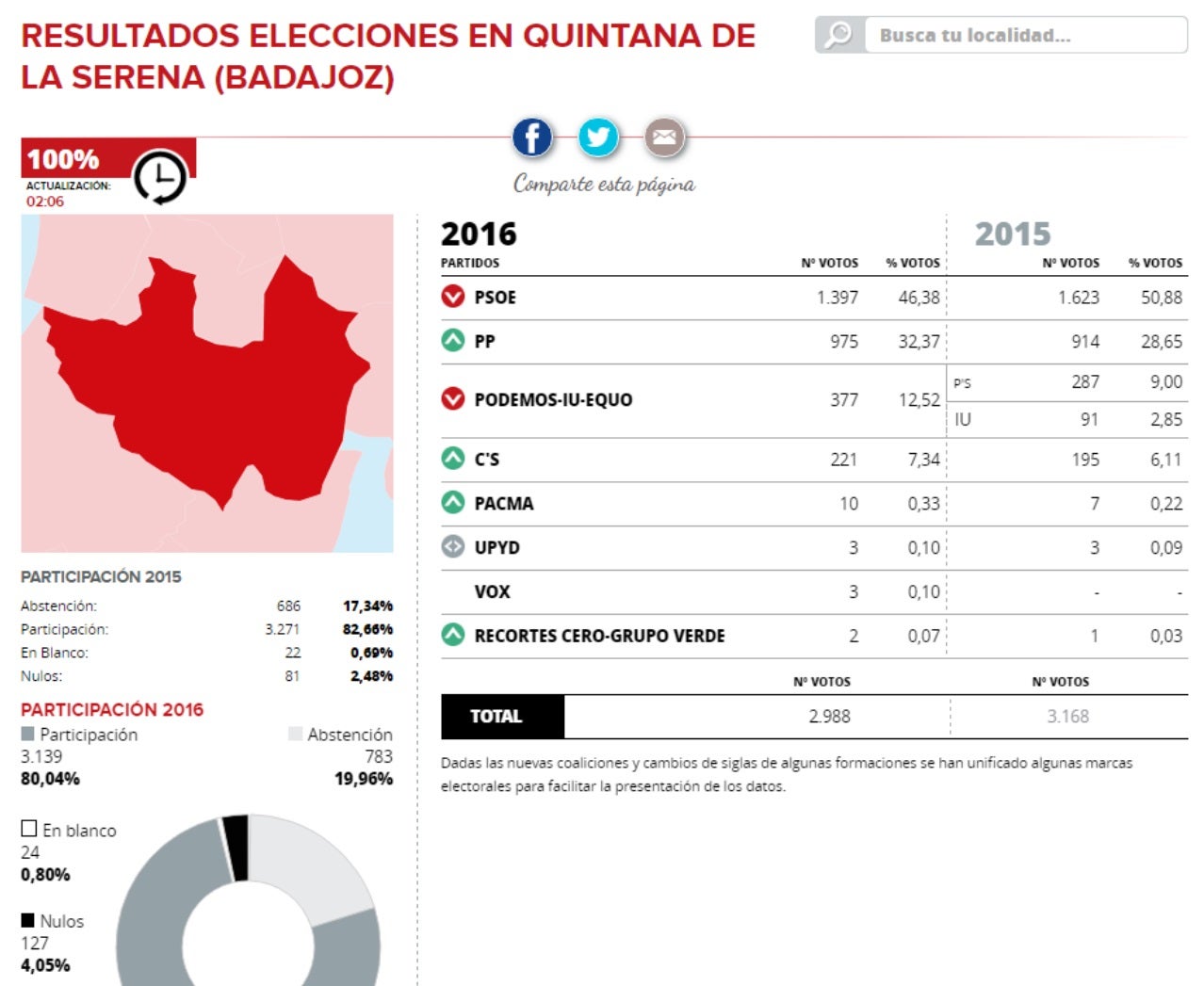 De esta forma, en Quintana de la Serena se observan ciertas similitudes con los resultados de las elecciones en Extremadura y en el resto del territorio español. El descenso de la participación, el aumento de apoyos al Partido Popular y la pérdida de votos del Partido Socialista se repiten en los escenarios nacional y regional. Sin embargo, tanto en Extremadura como en España el partido más votado fue el PP, algo que no ha sucedido en nuestro municipio, como tampoco se ha visto en Quintana una sustancial pérdida de votos de Unidos Podemos.