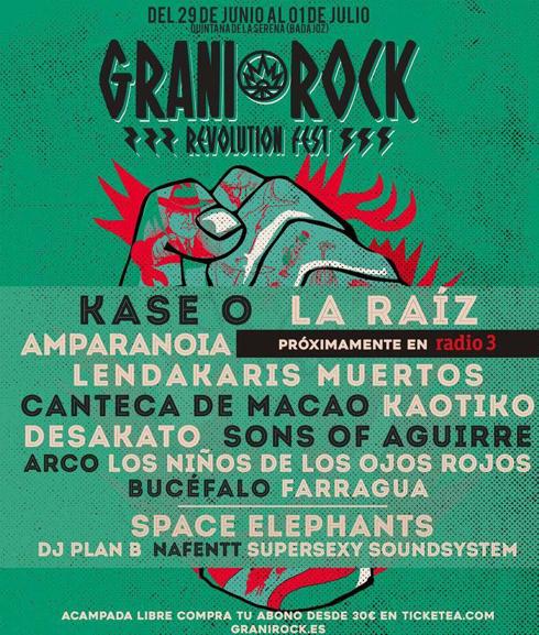 'La Raíz' fue una de las bandas que estrenaron la primera edición de Granirock en el año 2014, volviendo el siguiente al escenario quintanense. ... Éste se presenta como uno de los principales reclamos del cartel, al atraer a un elevado número de personas que acudirán a la localidad con el objetivo principal de ver actuar al grupo valenciano. Junto a él, Canteca de Macao, que repite este verano, también tomó parte en la primera edición hace ya cuatro años.