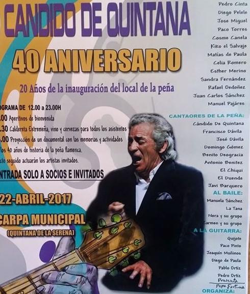 Con motivo de los cuarenta años de la Peña Flamenca Cándido de Quintana, su presidente José Mariano Reinoso y los socios en colaboración con el ... Ayuntamiento de Quintana a través de la Concejalía de Cultura y la Diputación de Badajoz, han organizado una fiesta conmemorativa y de reconocimiento por la trayectoria y evolución de su actividad creativa a lo largo de estos años. La peña flamenca de Quintana, se fundó en el año 1975, constituyéndose en el registro de asociaciones dos años más tarde.