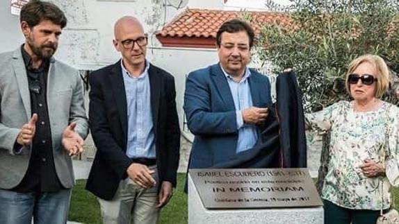 El presidente de la Junta, Guillermo Fernández Vara, en compañía del alcalde quintanense, José Ángel Benítez, destapó una placa en hornor a la artista quintanense
