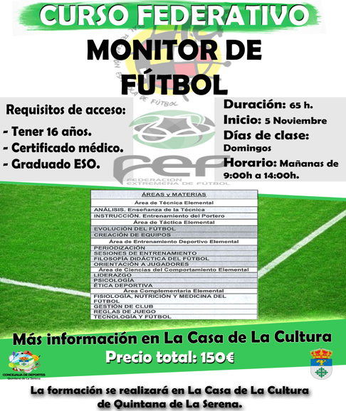 La Escuela de Deportes de la localidad ha anunciado un curso federativo de monitor de fútbol destinado a los jóvenes de la localidad y de ... los demás pueblos de la comarca. «Debido a la problemática que ha habido este año para encontrar un enrenador para el equipo senior, hemos considerado preciso dar esta oportunidad a los chicos que quieran formarse en este ámbito», declaró Joaquín Cáceres, concejal de Deporte, en el último pleno municipal celebrado.
