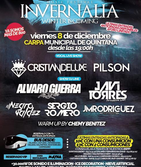 La localidad vecina de Quintana acogerá el próximo 8 de diciembre el festival Invernalia Music Festival. Un evento denominado por sus organizadores como "revolucionario", donde ... los jóvenes de la comarca podrán disfrutar de música más actual y el ambiente más animado haciendo frente a las bajas temperaturas que se registran en esta época.
