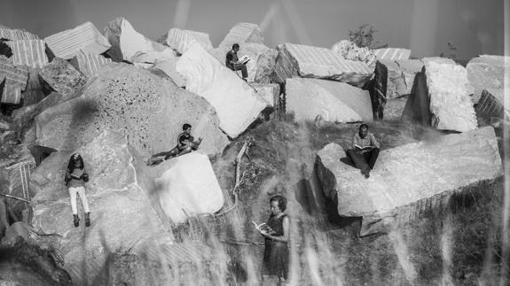 Cabe recordar que esta asociación local se creó para dar visibilidad a la actividad cultural del pueblo y poner en marcha una serie de iniciativas relacionadas con la tradición, la literatura, la pintura o la escritura, entre otras. «Precisamente la foto que realizamos con ellos es la más numerosa de la muestra. El resto son primeros planos y planos medios de dos protagonistas o como mucho tres». Asimismo, añade que para hacer la foto, los miembros de la asociación las trasladaron a los escombros de una cantera «Fue un lugar idóneo para hacer la foto por la luz y el paisaje, además era espectacular y resultó una fotografía muy originial al estar leyendo cada uno en un bloque de piedra. Fueron todos muy amables porque vinimos en pleno agosto y aún así aguantaron estoi