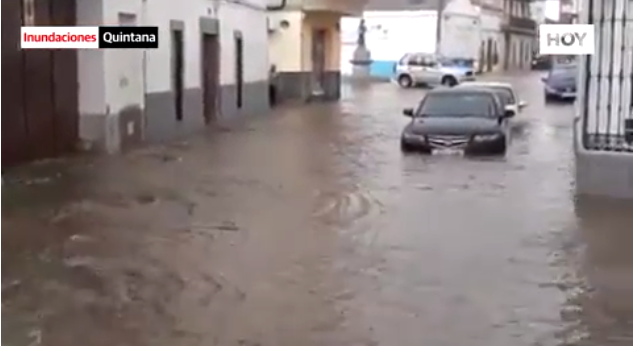 El fuerte aguacero caído este lunes pasadas las cuatro de la tarde en la localidad pacense de Quintana de la Serena inundó varias zonas y ... formó balsas de agua en los puntos más bajos del casco urbano. Durante media hora algunas calles se convirtieron en auténticos ríos. Los puntos más conflictivos fueron las calles Laguna, Severo Ochoa, Abajo y el parque de la plaza Hernán Cortés.