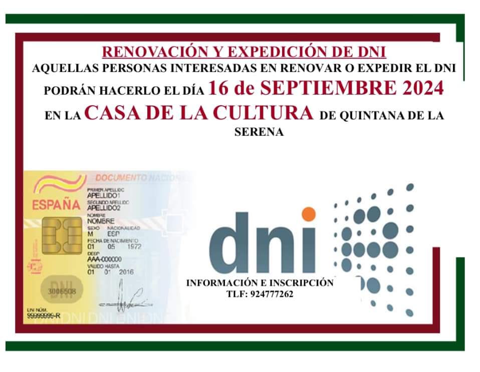 El Ayuntamiento de Quintana ha anunciado a través de RRSS las nuevas fechas para la renovación y expedición del Documento Nacional de Identidad.