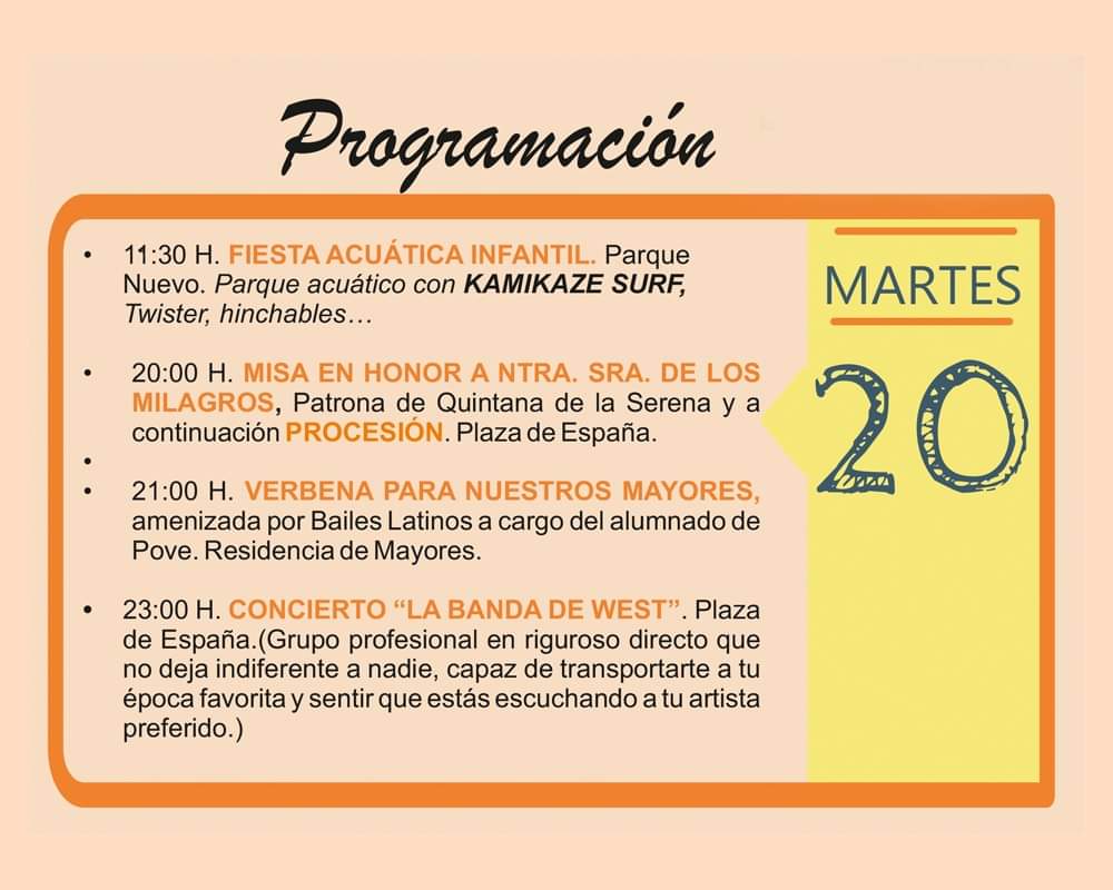 El Ayuntamiento de Quintana ha anunciado a través de RRSS una serie de actividades que se desarrollarán durante el 20 de agosto con motivo de ... las Ferias y Fiestas 2024.