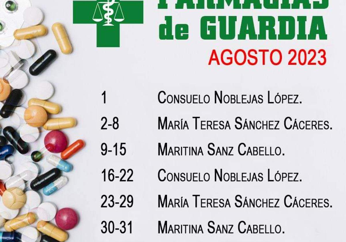 El primer día, será la farmacia de Consuelo Nobleja López la encargada de abrir las horas de guardia. La primera semana completa, del 2 al 8, será la de María Teresa Sánchez Cáceres la que brinde este servicio a los vecinos. Del 9 al 15, llega el turno de Maritina Sanz.
