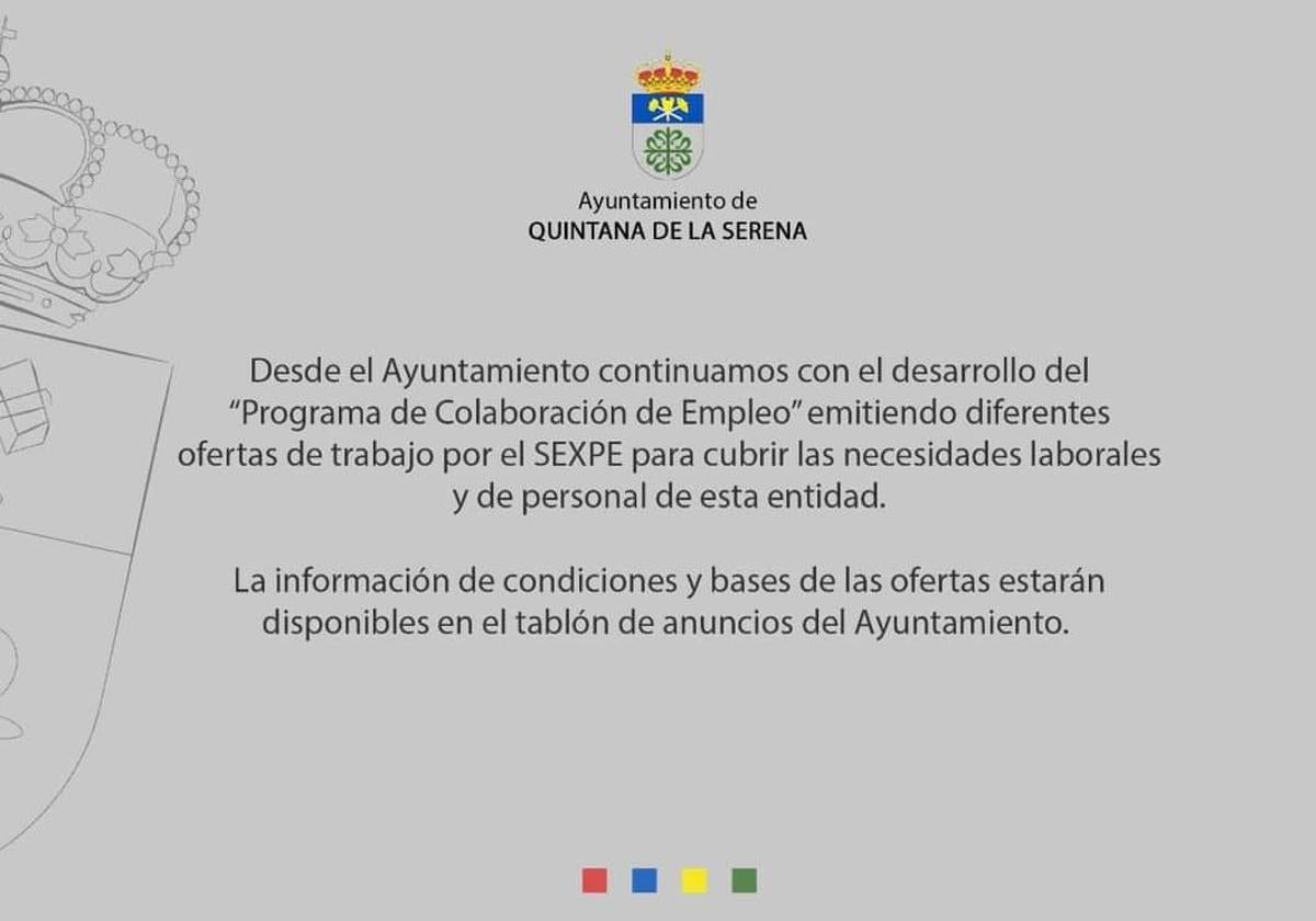 El Ayuntamiento de Quintana ha anunciado la puesta en marcha el Programa de Colaboración Económica Municipal de Empleo.por el cual se va a llevar la contratación de personas desempleadas demandantes de empleo, en este caso ofertando los puestos de celador/a, peones de servicios múltiples, auxiliar de enfermería, limpiador/a en general con discapacidad, auxiliar de ayuda a domicilio y diseñador/a gráfico/a.