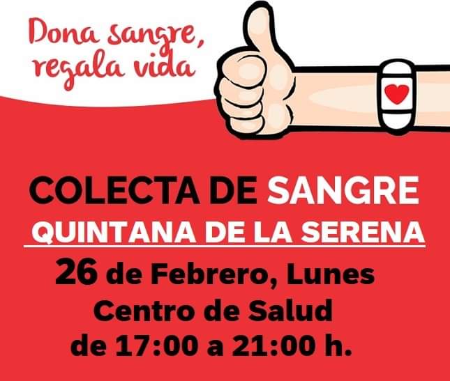 El lunes 26 de febrero, una unidad móvil del Banco de Sangre llegará a Quintana puesto que las reservas de sangre en Extremadura se sitúan ... por debajo de años anteriores, y por ello se está realizando esta campaña para aumentar el número de donaciones.