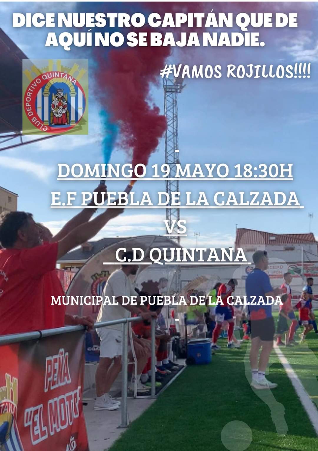 El CD Quintana vuelve a citarse con la historia el próximo domingo en la localidad de Puebla de la Calzada, buscando ser el vencedor de la eliminatoria, y conseguir seguir en la pelea por el ascenso a Tercera División, pasando a la semifinal de la promoción de ascenso.