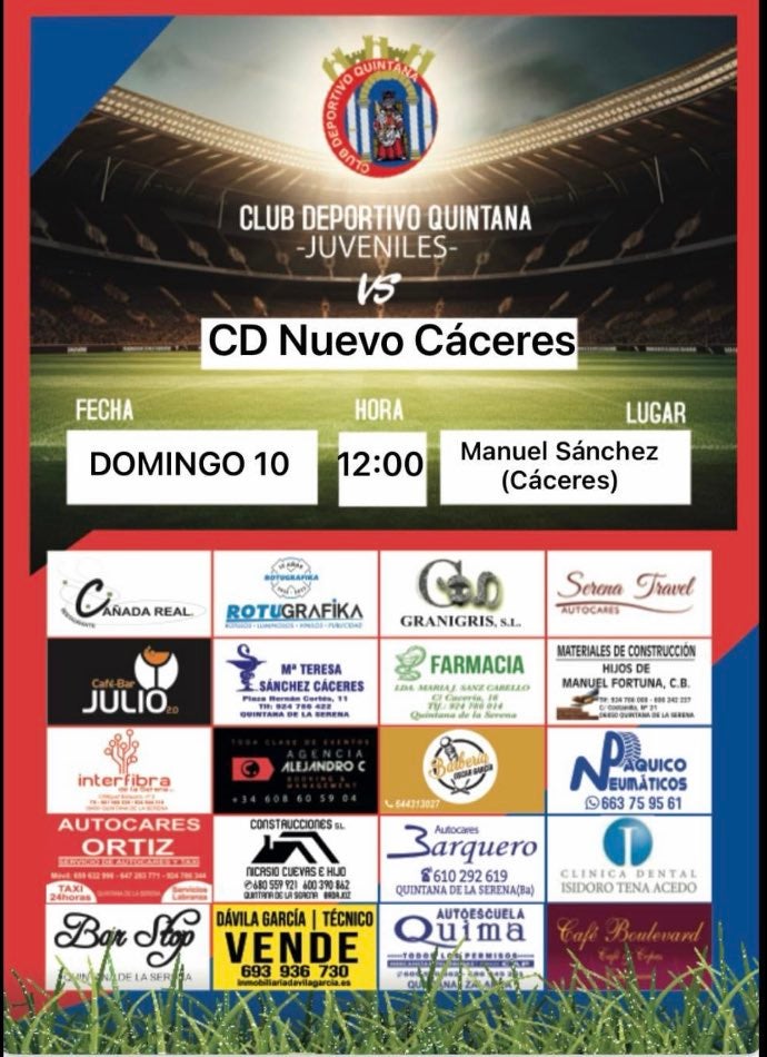 El CD Quintana Juvenil, tras lograr una importante victoria en la pasada jornada de liga de Primera División Juvenil ante el CP Vedruna que le ... consolidó en el primer puesto de la clasificación, se desplaza hasta Cáceres con el objetivo de sumar tres nuevos puntos.