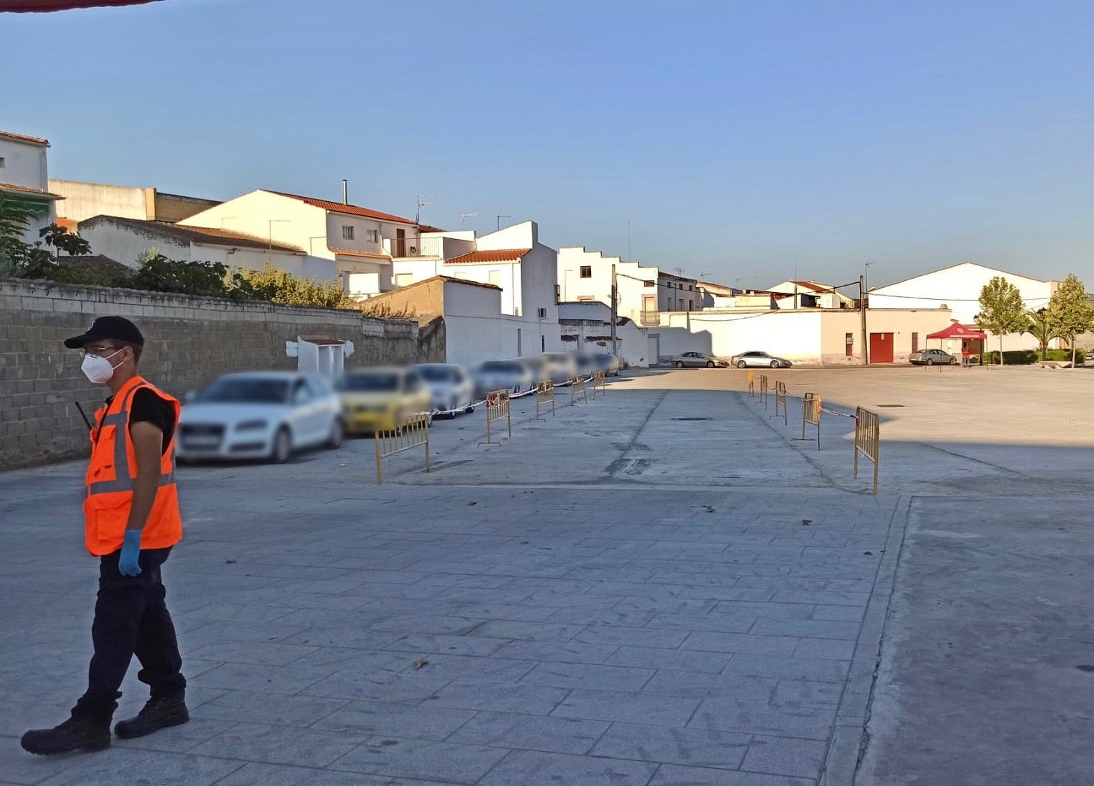 Cada día, al terminar la recogida de muestras, dos operarios del Ayuntamiento desinfectan las paredes, el suelo y las inmediaciones del recinto con hipoclorito sódico que trasportan en un tractor y con el cual también limpian las calles del resto del municipio todas las mañanas.