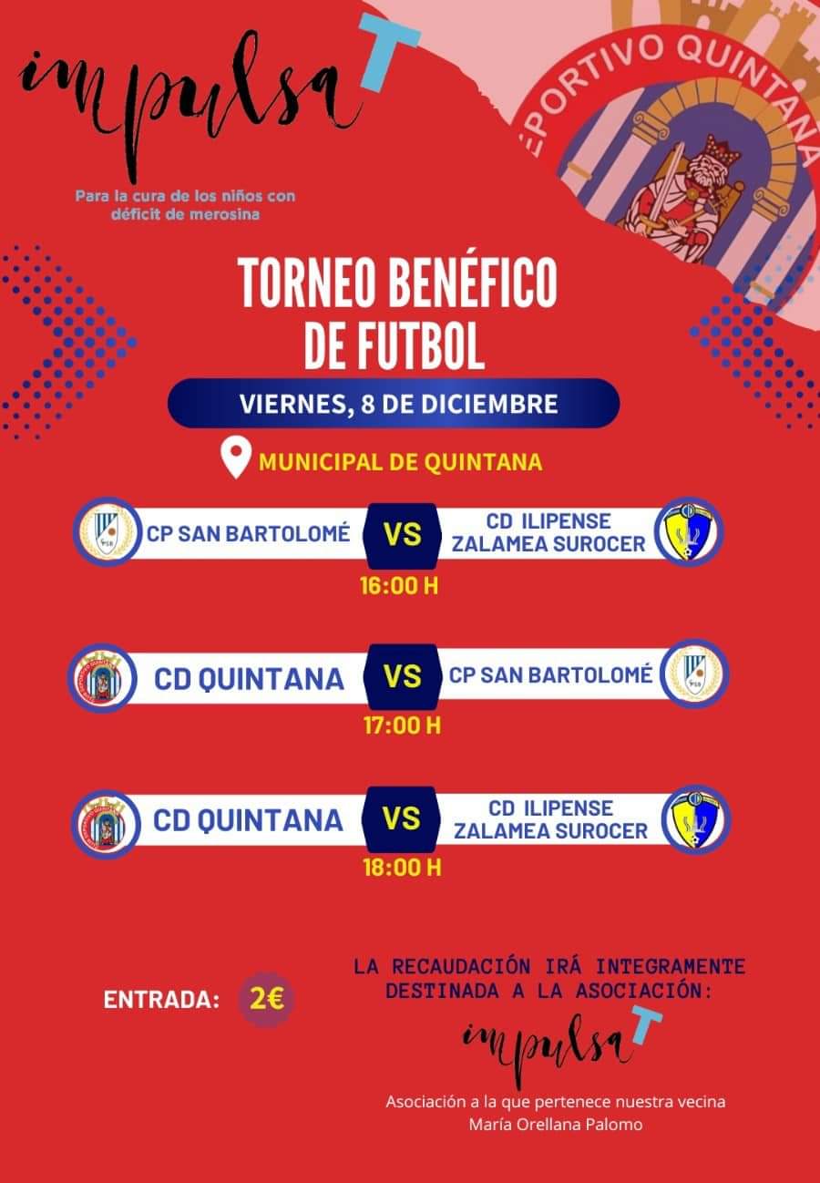 A pesar de que el fútbol en Primera División Extremeña ha tenido un parón en el fin de semana del 7, 8 y 9 de diciembre, el fútbol no para en Quintana, debido al torneo triangular de fútbol que enfrentará al CD Quintana, Ilipense Zalamea y CP Sán Bartolomé durante la tarde del viernes 7 de diciembre en el Municipal de Quintana.